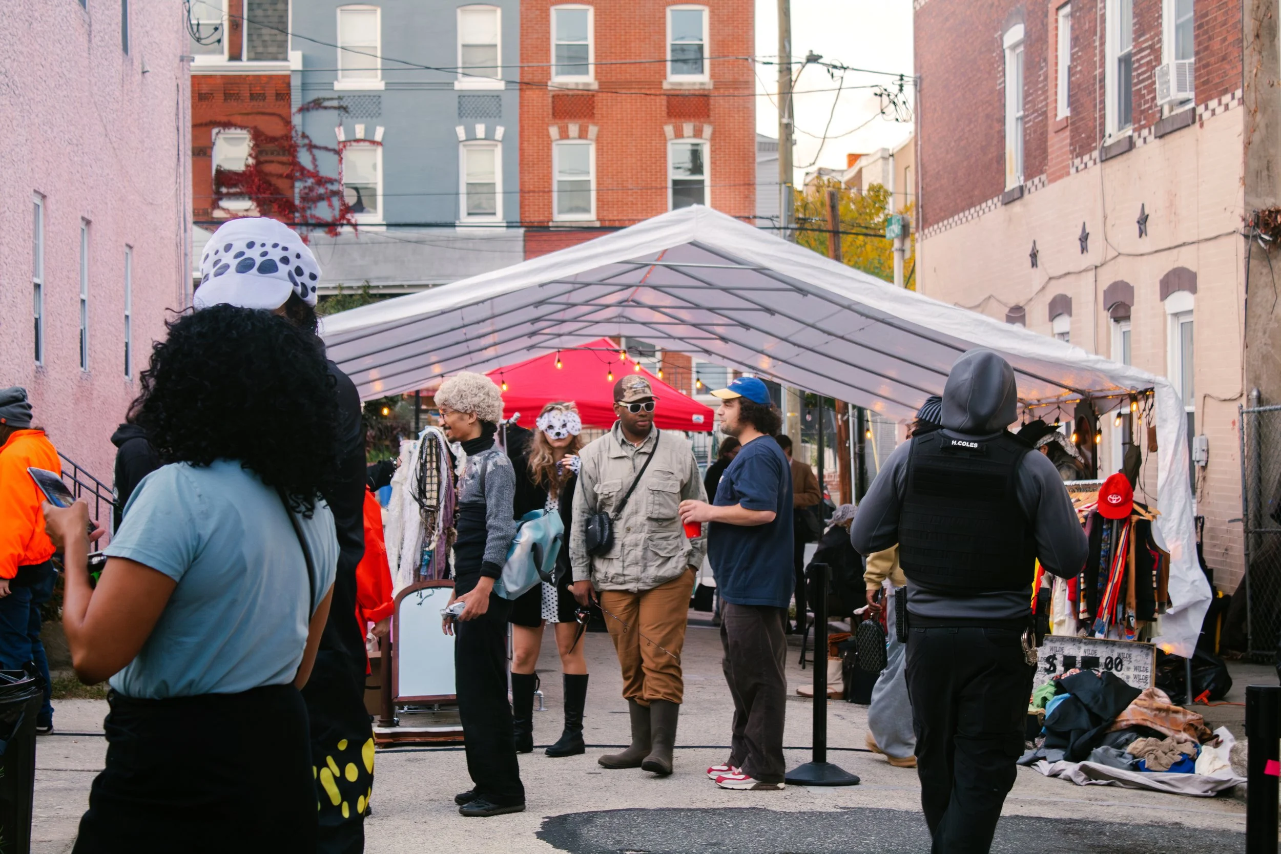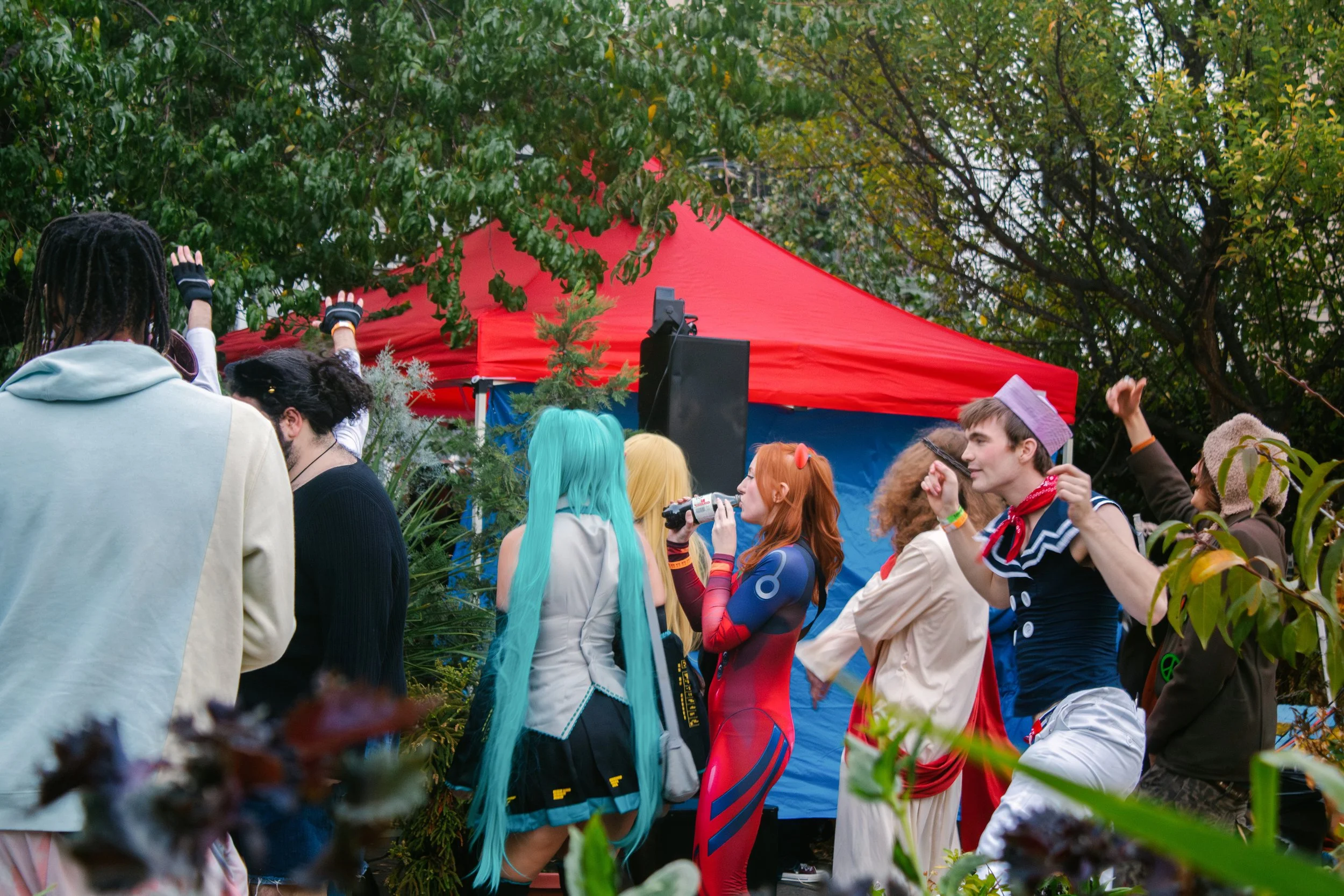 Students near the vendor tent at the Cat Park Halloween Block Party
