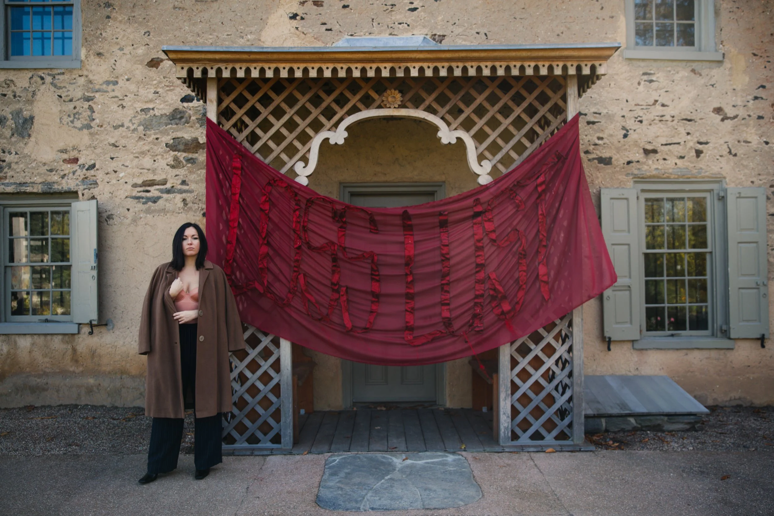 Throughout this transition, Costello discovered her ability to tell powerful stories on the streets. The idea of silk graffiti bloomed from the many questions dwelling in her mind, “How can I create work outside the studio that is 100% accessible? How can I make work that I can fold up and carry with me everywhere in my bag? How can I make resonating work with less, work that is less cumbersome & way more streamlined and minimal?” This art practice ranges from pieces that are 1 foot square to ones that are large installations. She rips silk apart and creates graffiti-style words by pinning and sewing on a larger fabric. Costello approaches silk graffiti intuitively, with no measuring necessary. She creates head-turning pieces using only scissors, fabric, sewing needles, and her own two hands and eyes from start to finish. Costello cemented her creative career in Philadelphia because “I felt comfortable in those spaces, and I’ve continued to invest because it’s given me space and accessibility to express my work. People here have given a lot of reciprocation and provided mutual care.”  Costello’s projects and silk graffiti work have been displayed at Philadelphia Airport, screened at the W Hotel, used in advertisement campaigns with ESSKA Shoes UK, and featured on Season 2 of SMILF, a Showtime television series.