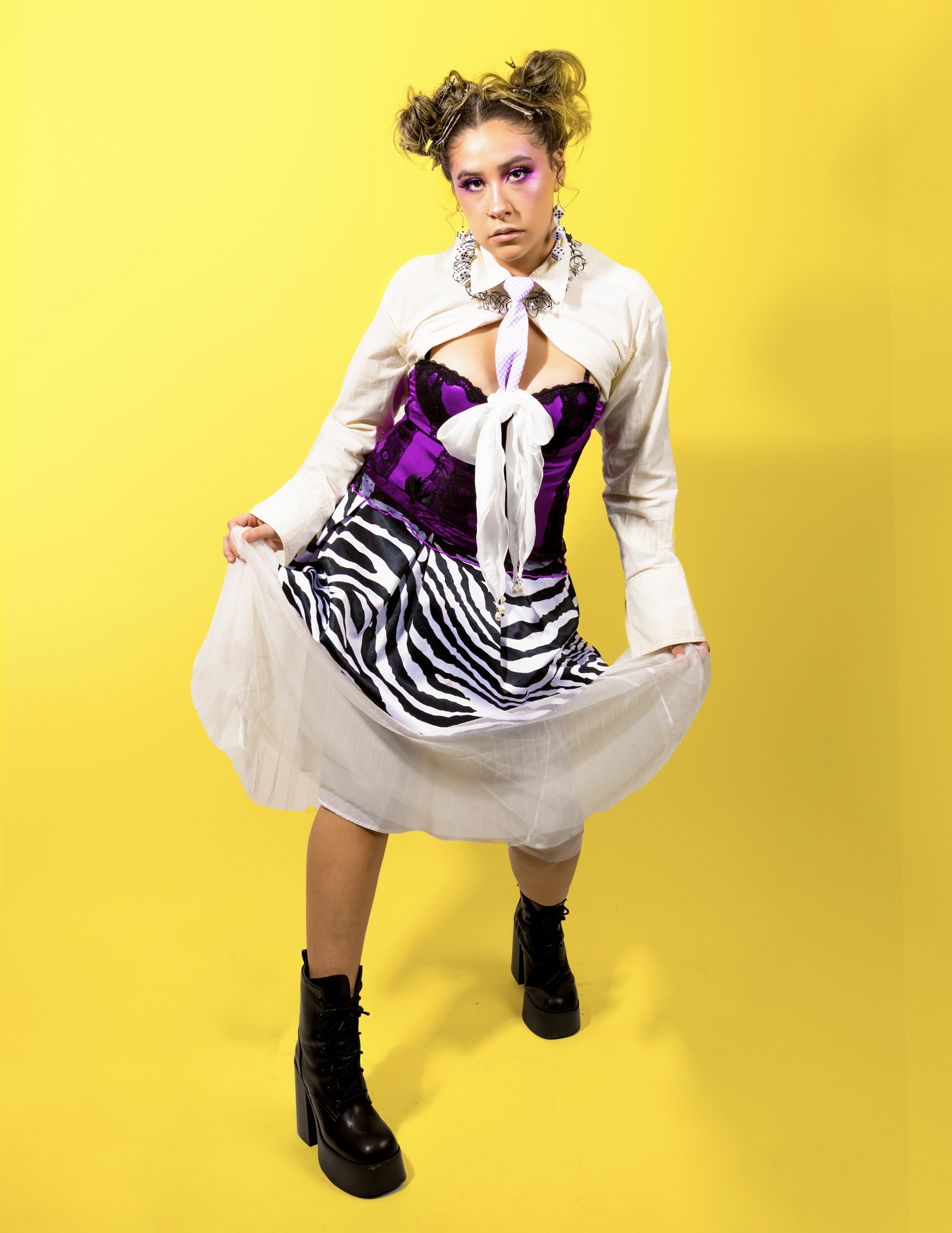 Purple Daze, the outfit I have put together, is based on vibrant purple hues, bold black and white patterns, and light flowy textures that add to the outfit. In this outfit I am wearing layered skirts, one that is zebra patterned and the other a white tulle skirt that was placed underneath. Then, I added a fitted purple corset over the skirts. On top of that, I added a cropped white long-sleeved button up that is buttoned at the top and tucked into the corset at the bottom. Each accessory was placed with intention; Starting with the white hair bow that was tucked into the top of the corset, the thrifted small white and purple child's tie that was velcroed under the collar of the white button up shirt, the black wire necklace with pearls, and the dice earrings. The hair was styled in my signature hairstyle, the high messy space buns with silver hair clips that ranged in size. The base makeup was neutral as well as the lip shade; however, the eye look consisted of a variety of purple shades that stretched across the lids and cheeks and brushed across the bridge of the nose for added dime.