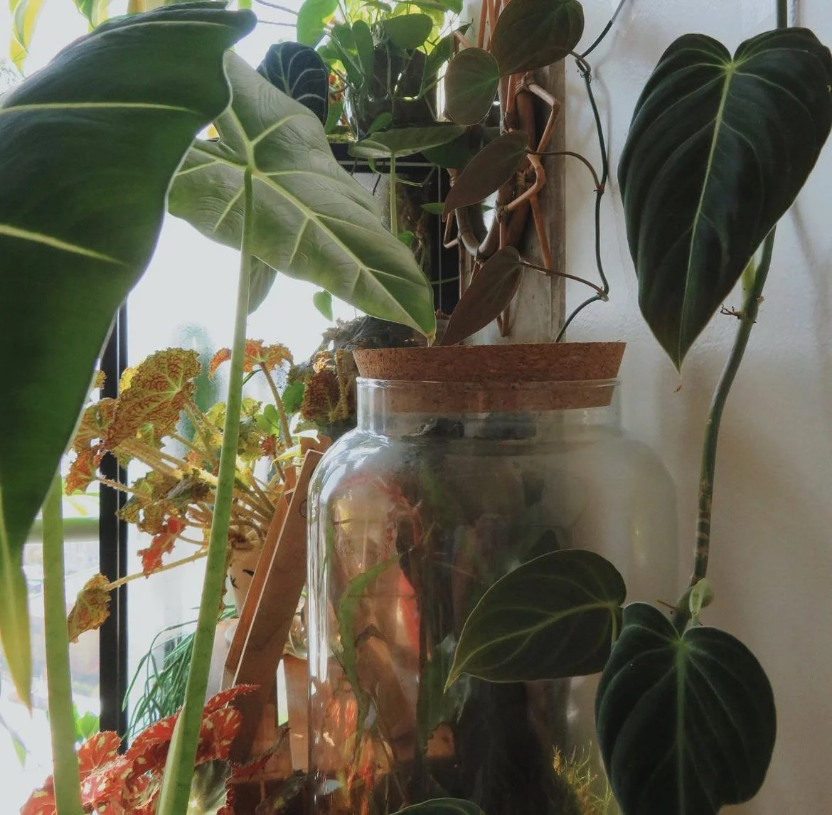 Carter’s plant sanctuary currently consists of two large greenhouse cabinets, several smaller glass terrariums, and a seemingly infinite number of pots ranging from the size of a thimble to nearly two feet across. Both cabinets feature misting systems on a timer to ensure the plants are hydrated and cared for constantly. In one terrarium, she installed a cooling system to decrease the temperature overnight, as the plants inside thrive in environments with temperature changes. The set-up takes over an entire living room space in our apartment, with plants growing up and down the walls and windows. “I really only water them once a week, and it takes about two hours each time, so it’s not as bad as you might think,” Carter explains, describing a typical week of plant care. “If I notice that any of them are looking dry throughout the week, I’ll water them individually.”