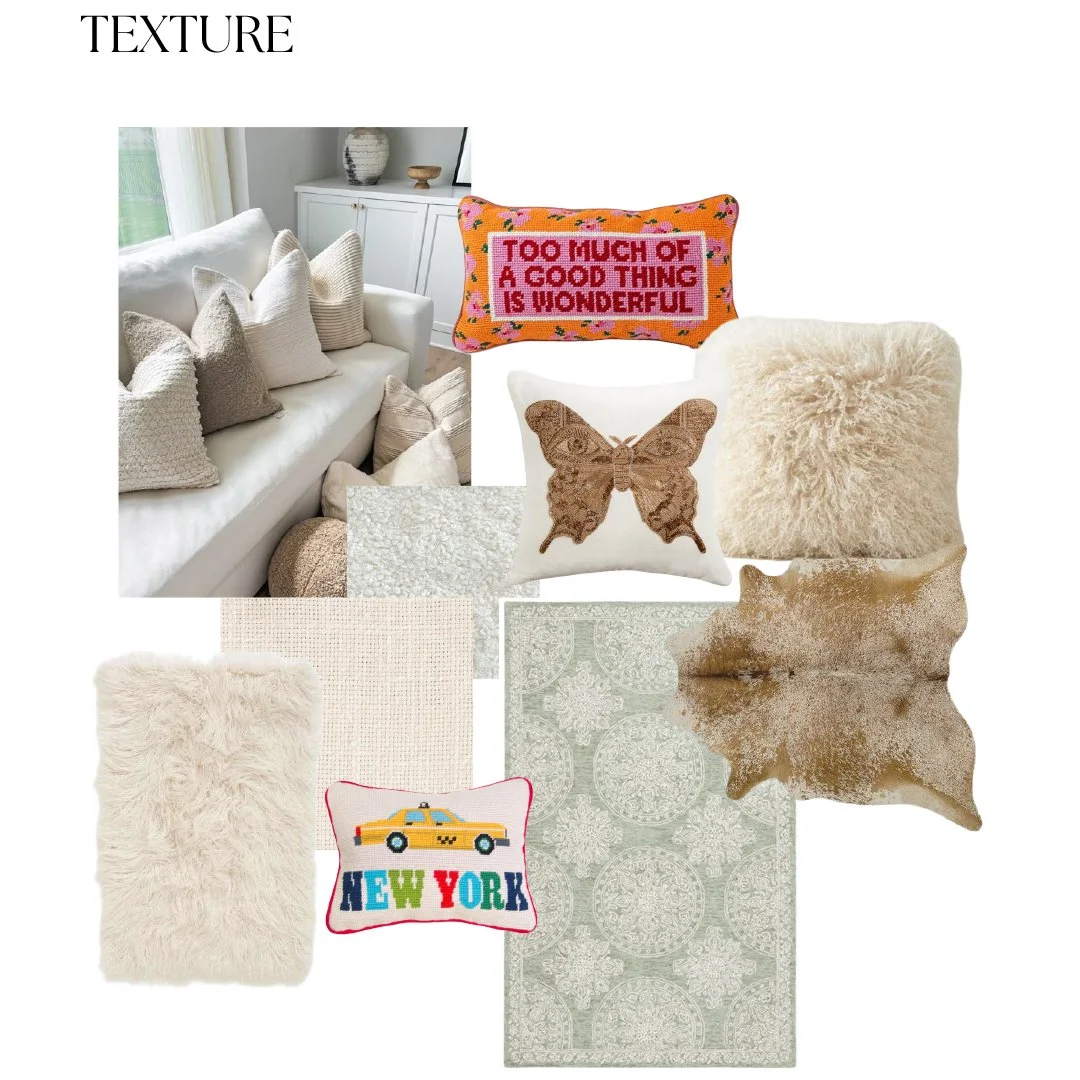 Texture enhances a living space by creating depth and warmth, instantly bringing your space to life and making it feel more dimensional and less flat. Soft textures like plush or fur rugs, cozy throw blankets, and embellished pillows can make a space feel inviting. Natural textures like wool and linen bring warmth and a sense of relaxation. Incorporating embroidered or patterned pillows adds visual interest while keeping the space cohesive. Combining smooth and rough textures, such as a sleek linen cushion paired with a shaggy faux fur pillow, creates contrast and balance. Layering different materials like leather and suede enhances the overall design. Whether through soft, touchable fabrics or structured, tactile surfaces, the right mix of textures can bring your space to life.