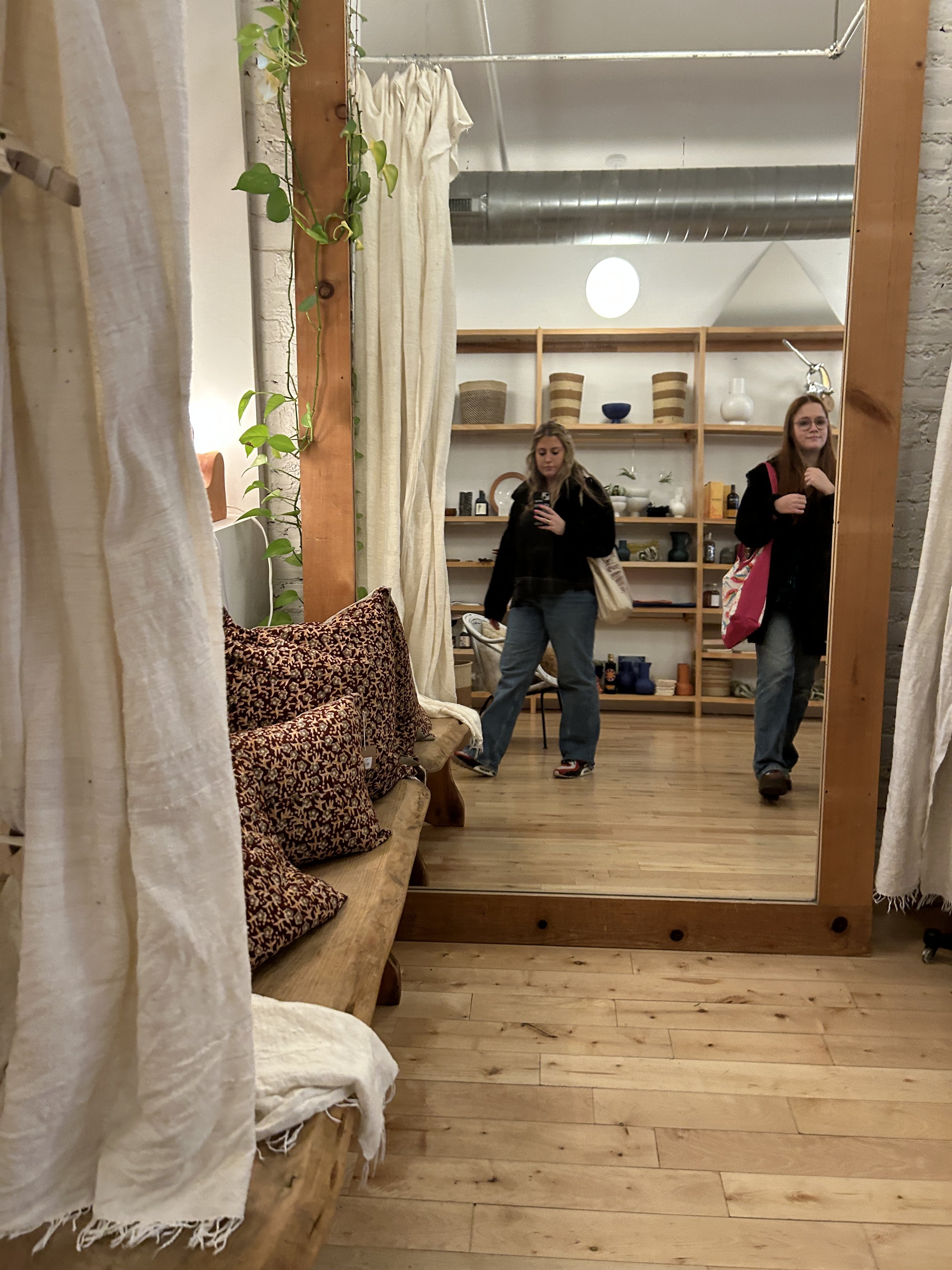 Moon and Arrow is a socially responsible boutique located right next door to Philly Vintage Bazaar. The clean, bright storefront was appealing right away, and the interior had the same vibe. Moon and Arrow is an excellent place to go if you are browsing for simple gifts like essential oils, candles, jewelry, or ethically produced notebooks. The store’s merchandise comes from local and non-local, ethical vendors, including Injiri, an India-based company emphasizing textile development and sustainable materials. Cozy sweaters made of some of the softest fibers I had ever felt were priced between $200-$300, all produced by independent, ethical artisans. The store also sold vintage jeans from popular brands like Lee and Levi’s that were in excellent condition. While all the clothing was beautiful- bohemian, neutral, and light- it was priced high and not somewhere I could realistically shop as a college student without a disposable income.
